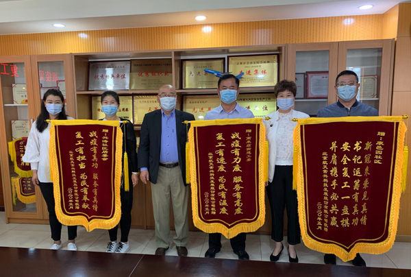 2020年5月12日,北京航天常興科技發(fā)展股份有限公司董事長(zhǎng)楊迺文、總經(jīng)理王德坤及董事會(huì)秘書趙琳向高米店街道工委、興濤社區(qū)居委會(huì)、康邑園社區(qū)登門拜訪并贈(zèng)送三面錦旗。