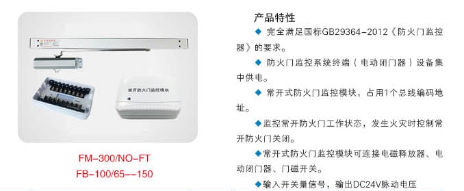 防火門監(jiān)控系統(tǒng)由防火門監(jiān)控器FJ-500、防火門監(jiān)控器分機(jī)FJ-500F、電動(dòng)閉門器FB-100/65/85/100/120/150、分體式常開防火門監(jiān)控模塊FM-300/NO-FT、分體式常閉防火門監(jiān)控模塊FM-300/NC-FT、一體式常閉防火門監(jiān)控模塊FM-300/NC-YT及門磁開關(guān)組成。