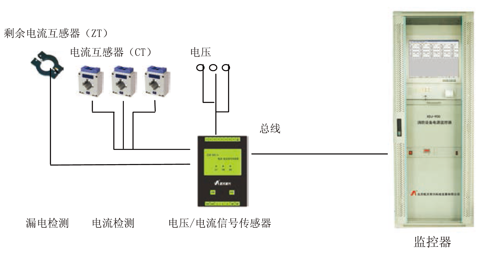 消防設(shè)備電源電壓/電流信號傳感器安裝于配電盤或配電柜內(nèi),監(jiān)控器安裝于值班室。