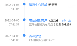 接收到此預警后,中心值守人員立即撥打此商戶電話,通知該商戶業(yè)主,告知商戶線纜溫度異常過高,具有重大安全隱患,請其立刻停止大功率用電器并斷電,并讓該業(yè)主立刻通知電工前往處置,隨即派單中心巡檢人員,讓其立刻前往現(xiàn)場復核處置該預警。