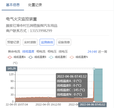 2022年04月06日07點41分04秒,蘭山街道智慧消防中心(以下簡稱“中心”)一級平臺接收到顏家紅埠寺村五網(wǎng)格振輝汽車用品商鋪中安裝的智慧用電設(shè)備發(fā)出的溫度預警。